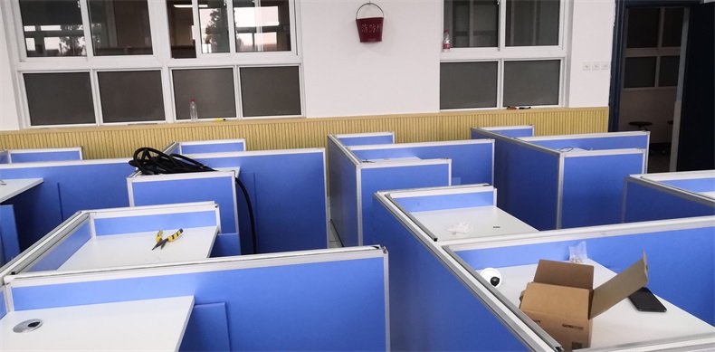 根據上海市新農學校多媒體升降屏風教室使用需求,在產品設計方面,電腦桌的左、右、前三面帶升降屏風擋板,用于隔斷相鄰考生視線。當屏風升起時,可以用作教室計算機標準化考試使用,當屏風降下時,可以用于學生上課使用。實現了一室多用、考學合一。