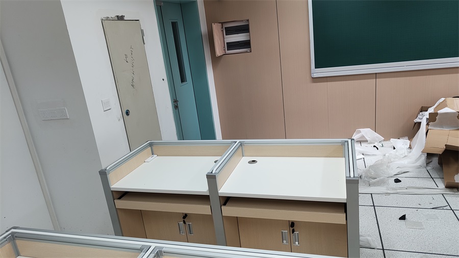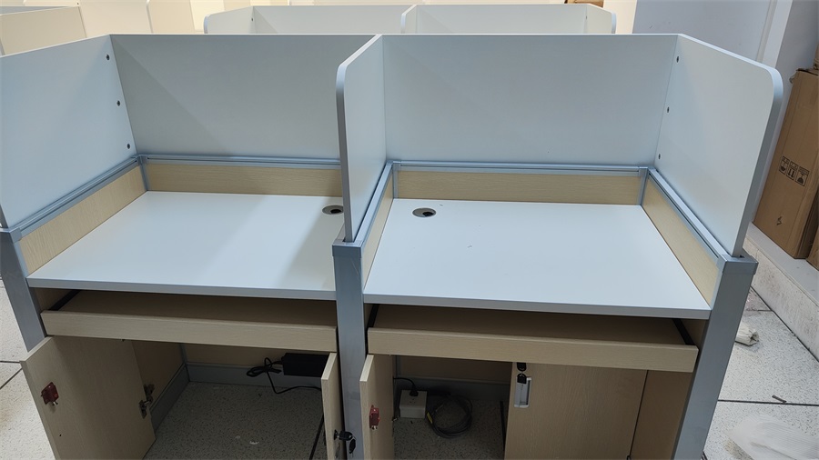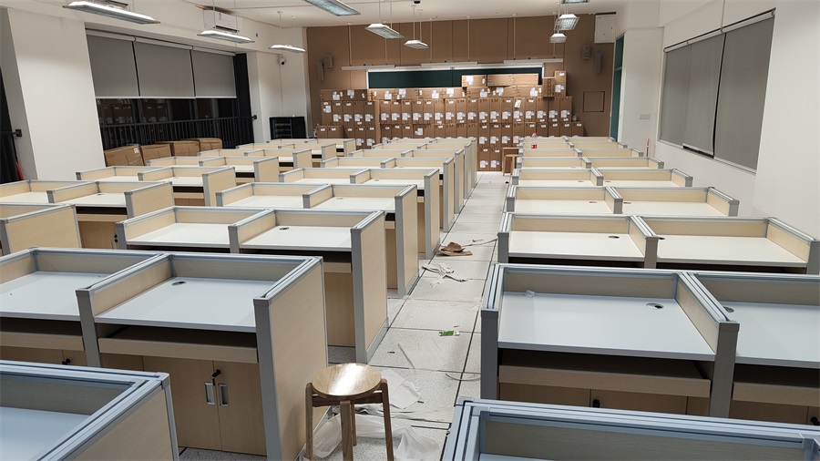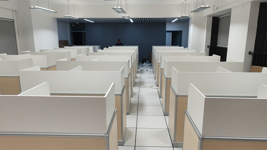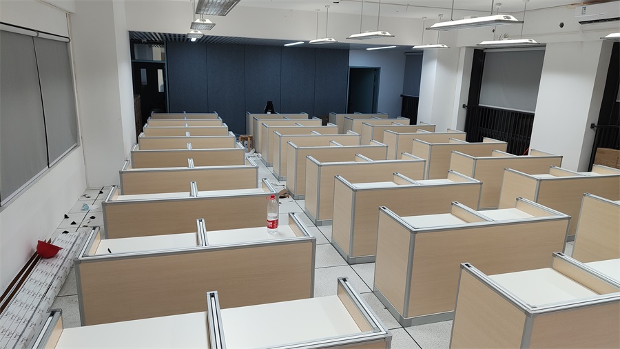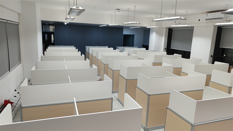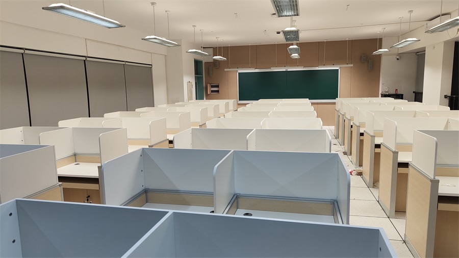 根據(jù)深圳市龍華區(qū)龍騰學(xué)校對升降屏風(fēng)語音教室的使用需求,方方智能對該教室設(shè)計了一套可以升降的智能升降屏風(fēng)桌,每個座位都有可升降的屏風(fēng),考試時屏風(fēng)升起后可有效的隔斷相鄰人的正常視線,防噪音效果,可達(dá)到互不干擾的作用,當(dāng)屏風(fēng)降下時,可以用于學(xué)生日常上課使用。實現(xiàn)了一室多用、考學(xué)合一。
