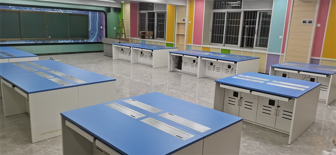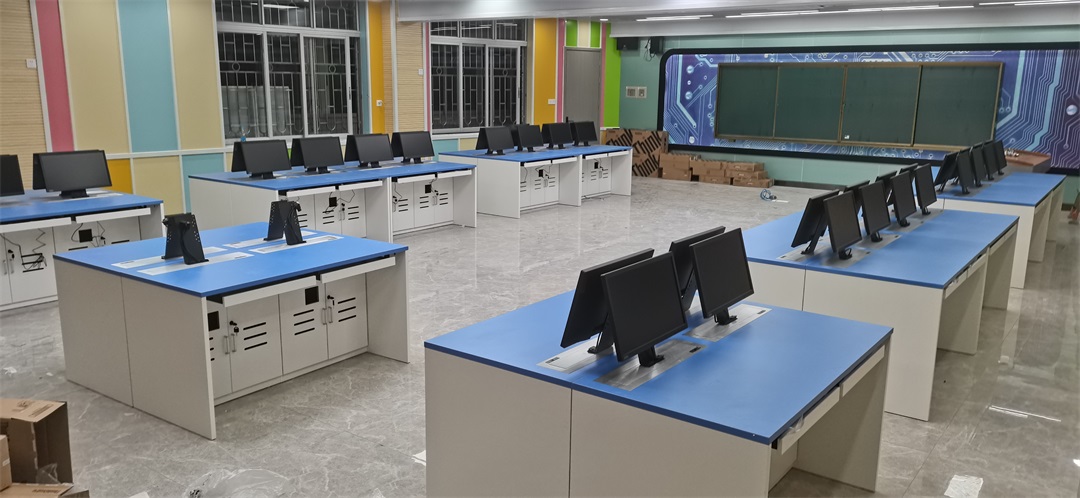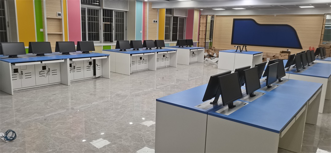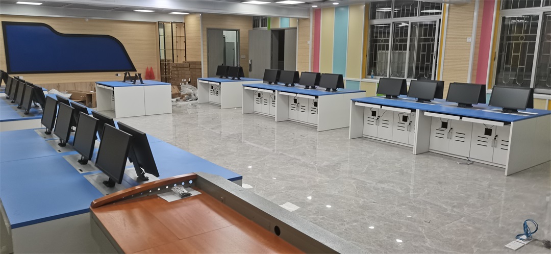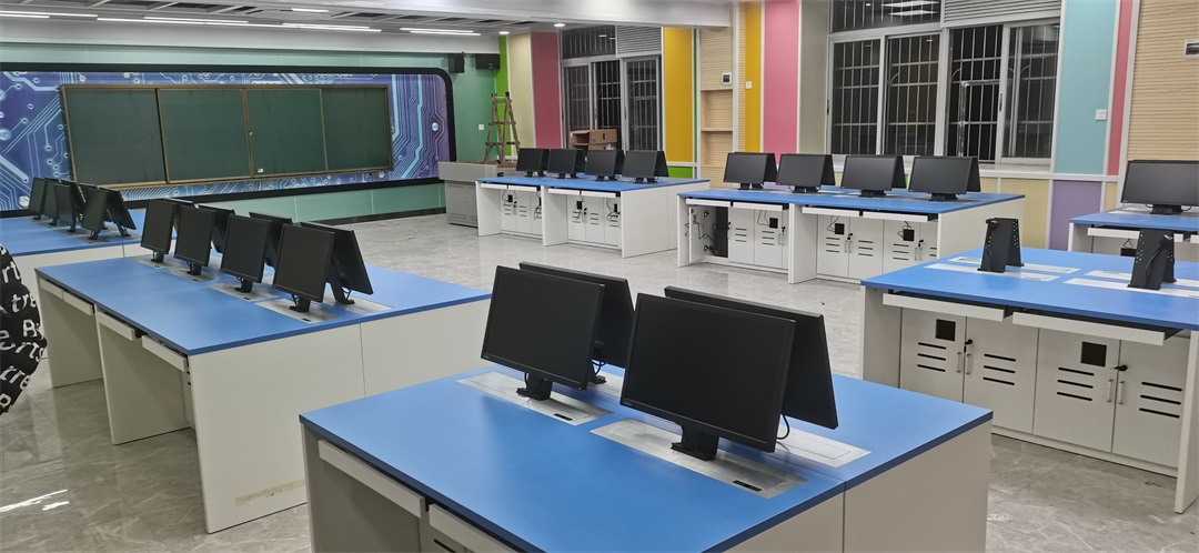 根據廣州第1中學美華學校對多媒體教室使用要求,方方智能為該學校設計了每個桌子桌面裝有液晶屏升降器,需要使用顯示屏時,隱藏在桌子內部的液晶升降器把顯示屏從桌子下面升出桌子上面;當不使用顯示屏時,液晶屏升降器自動下降,顯示屏隱藏在桌子內部,起到防盜、防塵作用,保持桌子表面的平整和美觀,實現了一室多用。