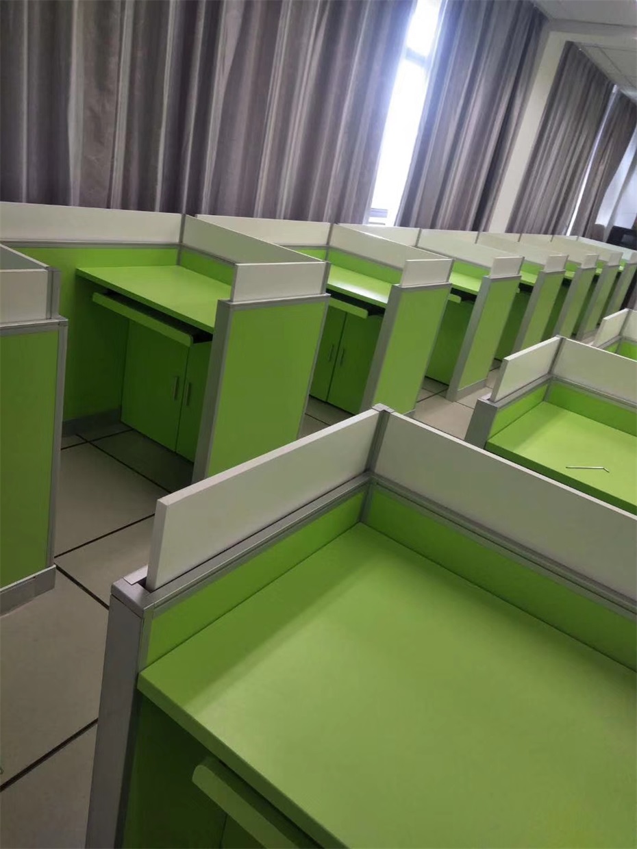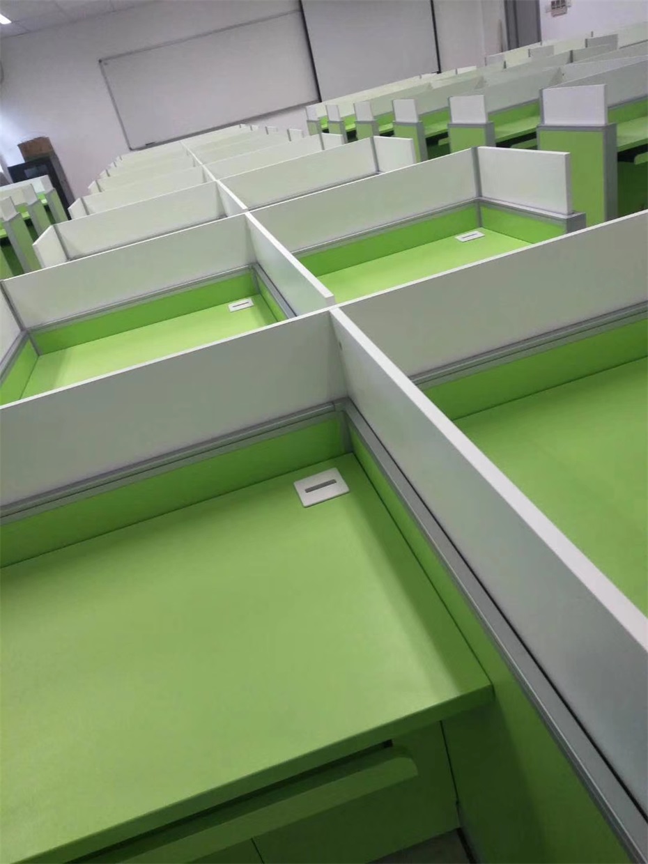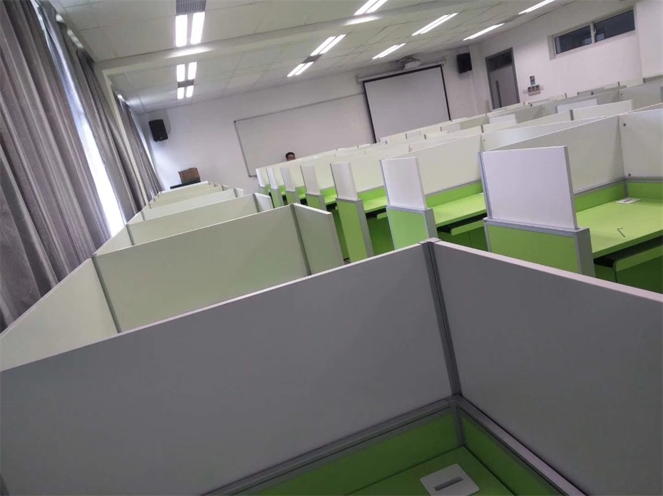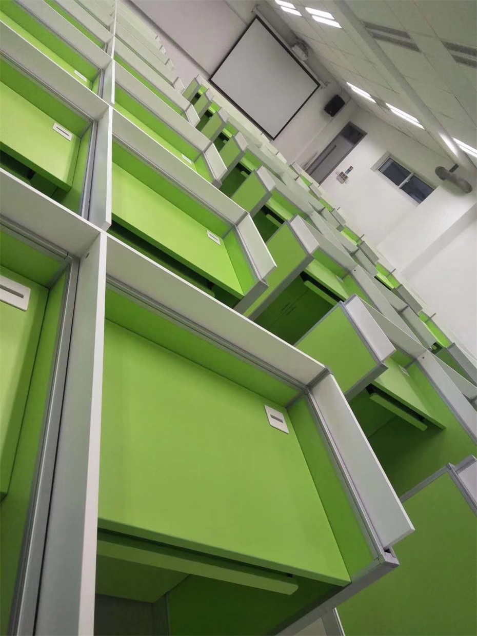 根據上海復旦大學附屬中學多媒體教室的使用需求,本次教室設計了一套采用智能升降屏風桌,每個座位都有可升降的屏風,考試時屏風升起后可有效的隔斷相鄰人的正常視線,防噪音效果,可達到互不干擾的作用,平時上課時屏風降下,和普通的教室無異,滿足一教室多用的需求。