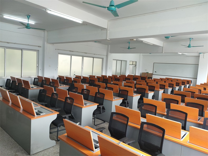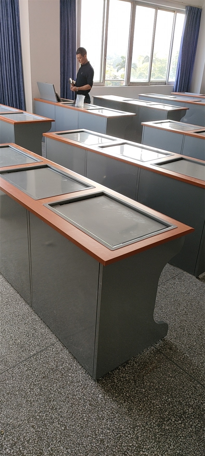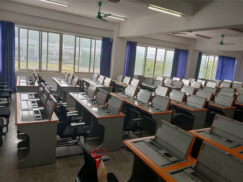 根據惠州學院計算機教室使用要求,方方智能為該學校設計了電腦翻轉桌。翻轉器與電腦桌配套使用,拉動開關按鈕液晶顯示屏會自動翻起,鍵盤也同時升起與桌面齊平;當不需要使用電腦時,可用手動按下翻蓋面板,整個翻轉器與桌面齊平,和普通的教室無異。產品具有防盜、防塵保持桌面平整,美化桌面等功能,電腦桌內還可以存放各類文具和學習用品,實現普通教室與計算機教室模式相互切換快速,不阻礙老師與學生之間目光交流,滿足一教室多用的需求