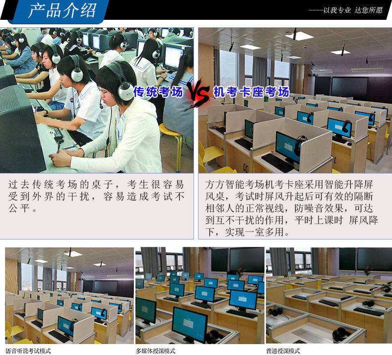 1、*固定屏風高度850mm,桌面高度750mm。活動屏風行程850-1400mm。形成獨立空間,起到良好的隔音隔斷效果,確保能最大程度降低相鄰學生之間考試時的互相干擾和影響.