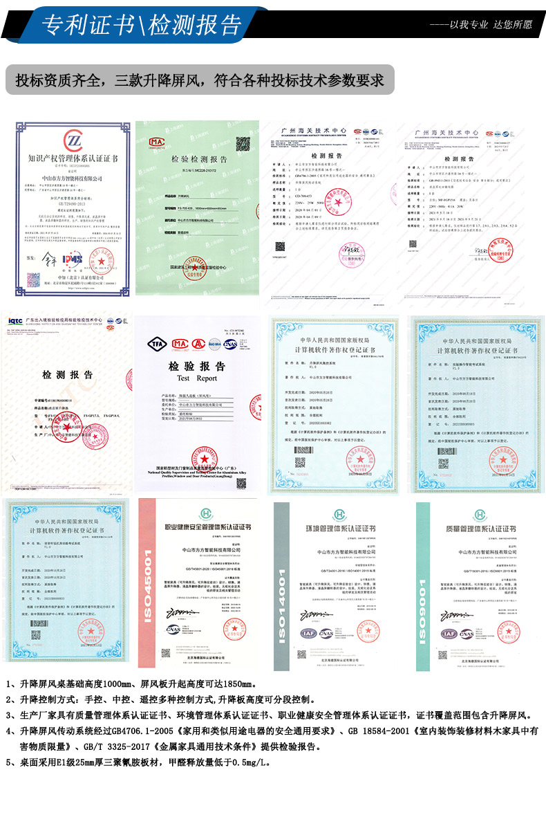 11、*升降屏風符合GB 18584-2001《室內裝飾裝修材料木家具中有害物質限量》、GB/T 3325-2017《金屬家具通用技術條件》提供生產廠家檢驗報告。升降屏風傳動系統符合GB4706.1-2005《家用和類似用途電器的安全通用要求》提供生產廠家檢測報告。