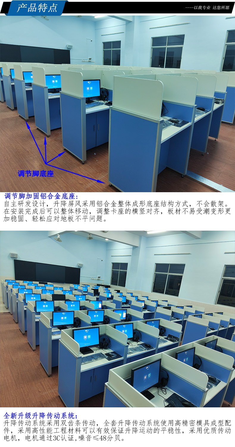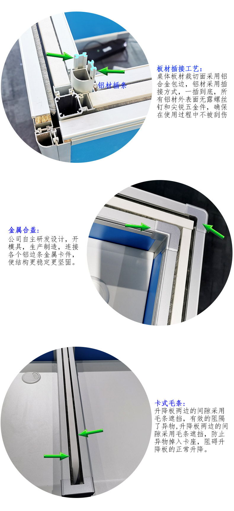4、*升降屏風(fēng)采用一體成形鋁合金型材整體包邊,安裝完成可整體移動(dòng),調(diào)整卡座的橫豎對(duì)齊,板材不易受潮變形更加穩(wěn)固;桌體采用鋁材插接方式連接,所有外表不漏螺絲釘或尖銳五金件,確保使用身體不被劃傷。